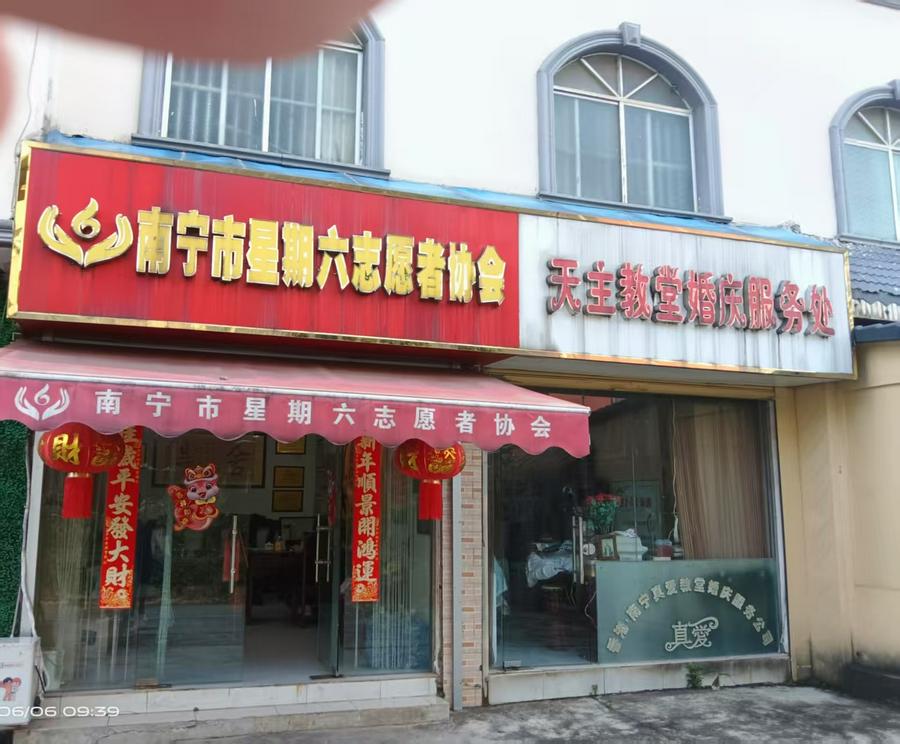 在这里,我看到设于主教府外面建筑的“南宁市星期六志愿者协会”、天主教堂婚庆服务处。
