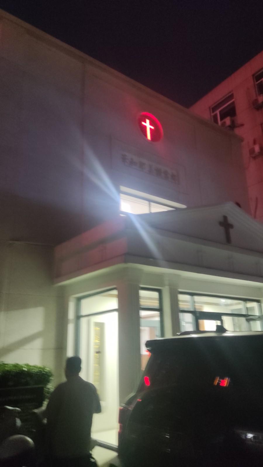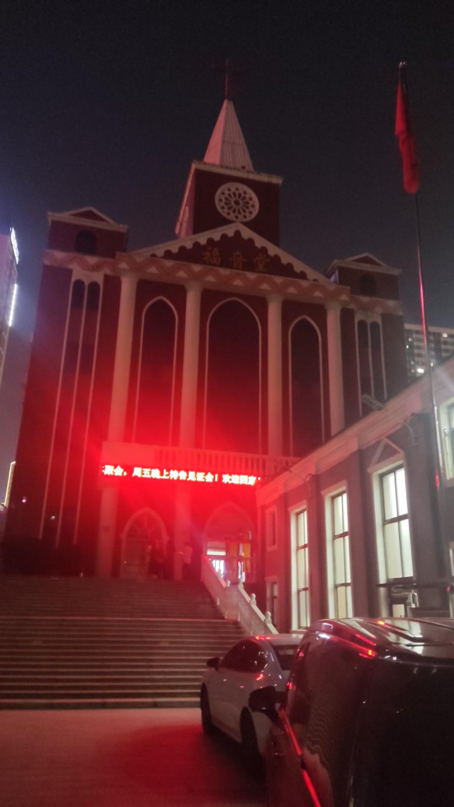 与辉煌的地标建筑相比,暗夜里的教堂轮廓暗淡了许多,但隐约可见。教堂主楼的红色十字架散发红色光芒,仿佛夜里的明灯,映照夜空。教堂正面镌刻着“都当赞美耶和华”的石刻,门口悬挂的铜牌上赫然写着“新华区文物保护点——新华路福音堂”。
