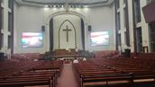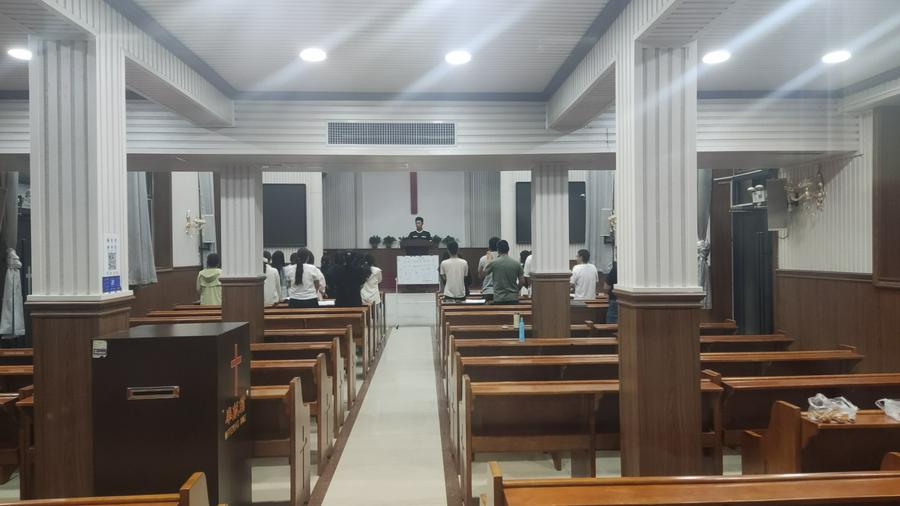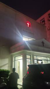 老教堂内灯火通明,一些信徒正在聚精会神地学习圣经。门口两旁石刻的楹联,正楷字体苍劲有力。福音堂新堂上为尖顶,下面方形,再下面是三角形,镌刻“福音堂”字样。门窗为圆拱形,整体宏伟壮观。沿着宽敞的台阶,进入教堂,主堂内宽敞明亮,一排排崭新的座椅排列整齐,几位同工正在调整音响器材。圣台正中的十字架成为焦点,令人肃然起敬。副堂内,几位青年弟兄姊妹肃立歌唱,赞美的歌声引起我心灵的共鸣。