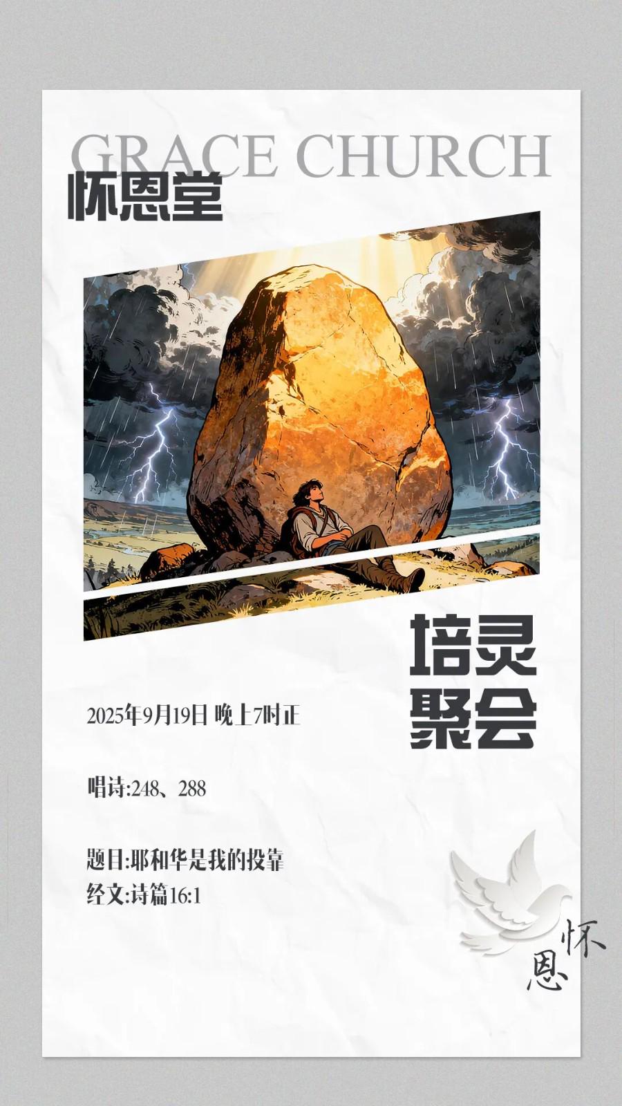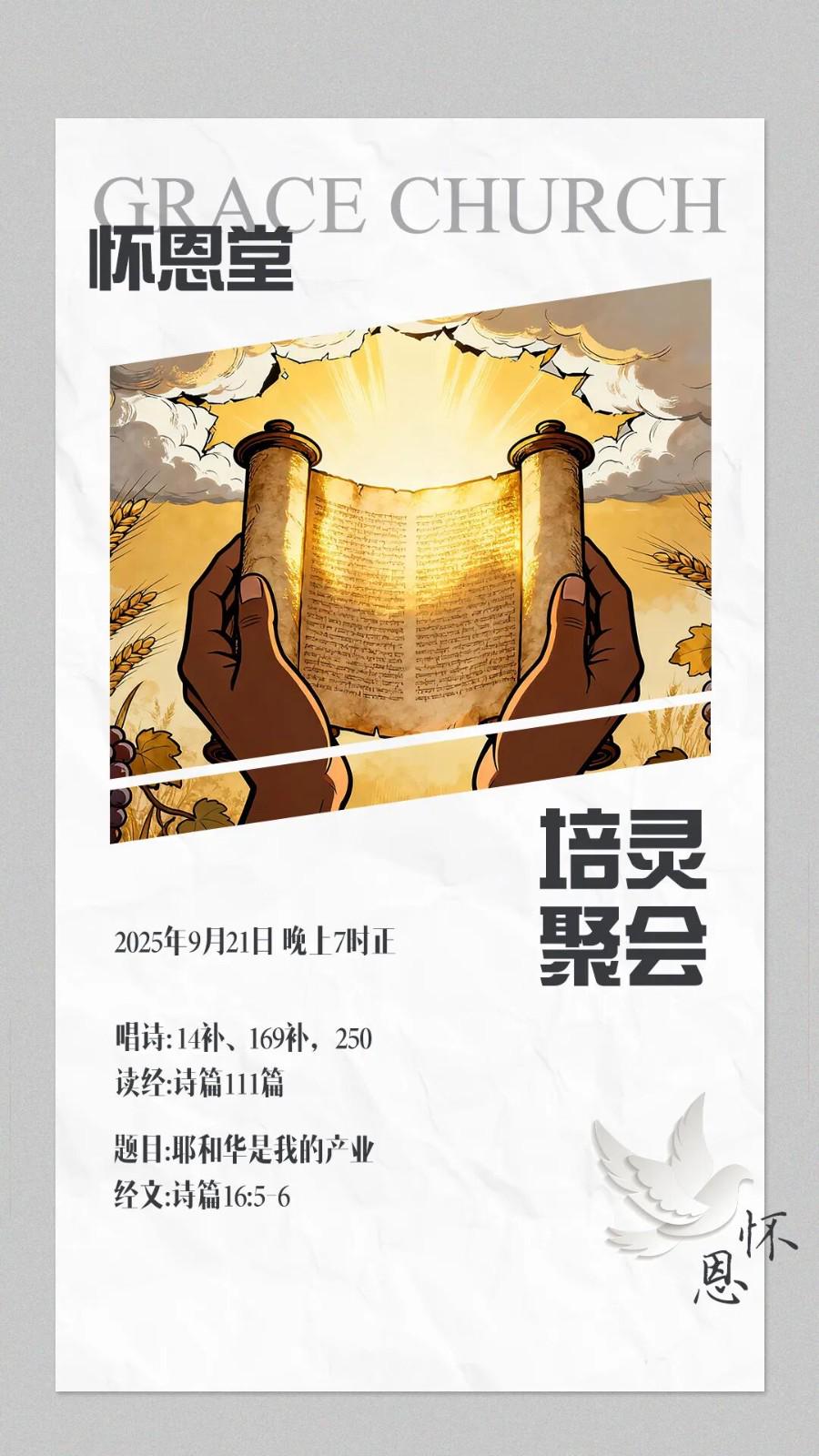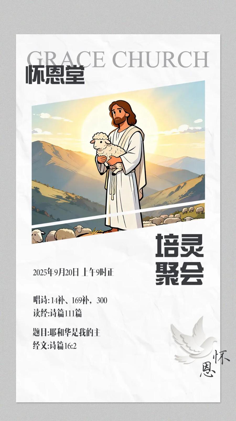 上海怀恩堂公众号发布 “2025 年培灵聚会预告”,活动将于 9 月 19 日至 21 日举办,连续推出 4 场主题聚会,以 “耶和华是我的投靠”“耶和华是我的主”“耶和华是我的喜悦”“耶和华是我的产业” 为题,围绕诗篇经文展开分享。