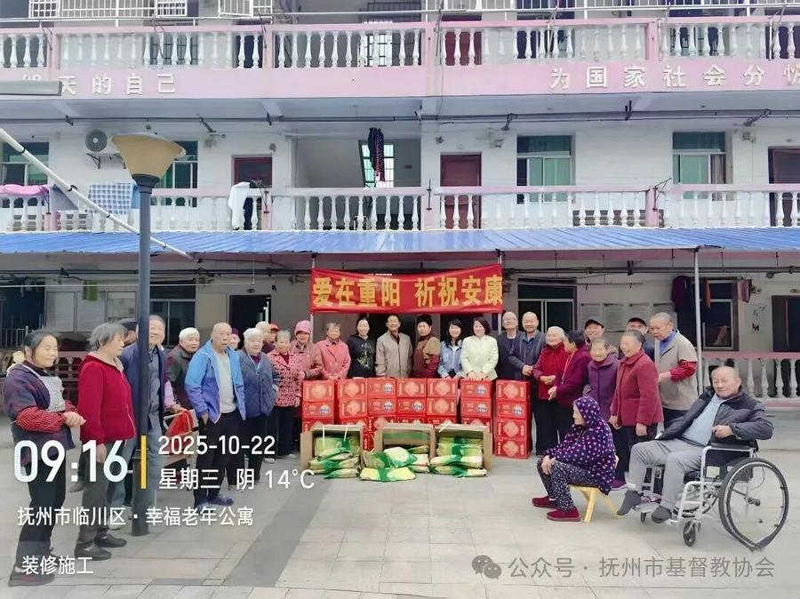 2025年10月18日至19日是中国基督教两会号召的公益慈善主题日,今年活动主题为“根植于爱,结出怜悯的果实”,抚州市临川区基督教永恩堂和宏恩堂积极响应相关号召,于2025年10月22日组织教牧同工、堂委、部分义工人员到市区幸福老年公寓进行了“爱在重阳、祈祝安康”关爱老人慰问活动。通过开展主题活动、以实际行动彰显抚州市临川区基督教界服务社会的良好精神面貌。