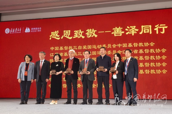 中国基督教协会会长吴巍牧师应邀为爱德基金会合作伙伴颁发纪念奖杯。
