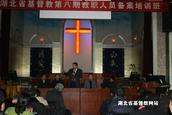 2012年3月21-23日,湖北省基督教第八届教职人员(传道员)备案培训学习在湖北咸宁市举行。3月21日下午湖北省基督教两会教牧同工一行在湖北省基督教协会会长朱致国牧师的带领下,冒着绵绵细雨,前往咸宁市温泉中心堂给来自咸宁5个市县的121位传道员进行教职人员(传道员)备案培训学习。