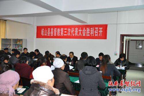 2012年3月22日,陕西省岐山县基督教第三次代表大会在县基督教堂四楼会议室顺利举行,来自省、市、县宗教界领导及县内代表计70余人参加大会。