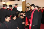 按立仪式由河南省基督教三自爱国运动委员会主席兼省圣经专科校长唐卫民牧师主礼;河南省基督教协会会长胡俊杰牧师、省基督教两会副主席、副会长王福增牧师、贾九宝牧师、阎书刚牧师、臧保如牧师、张富华牧师、孙宏赦牧师、马鑫牧师、郑春时牧师、白建德牧师襄礼,来自河南圣经专科学校的学生及各地堂点的基督教信徒代表1000多人参加了这次按立圣职典礼。这次按立典礼受职者分布在豫东、豫西、豫中和豫北的十一个地区,2012年度第二次按立事工近期将在豫南七个地区中进行。