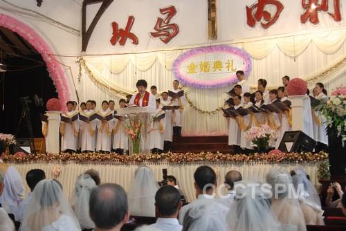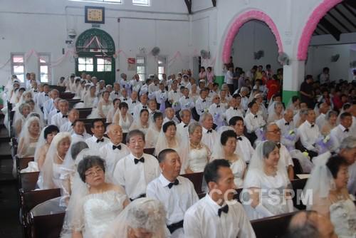 2012年6月16日上午,辽宁省沈阳市东关基督教会为80对结婚超过五十年的老人举行了隆重的金婚礼拜。当天,“新娘”穿着洁白的婚纱,“新郎”打着帅气的领结,在婚礼进行曲中挽手步入教堂。吴明峰牧师证道。金婚夫妇互赠感恩卡和玫瑰花以感谢彼此五十多年真心的付出。
