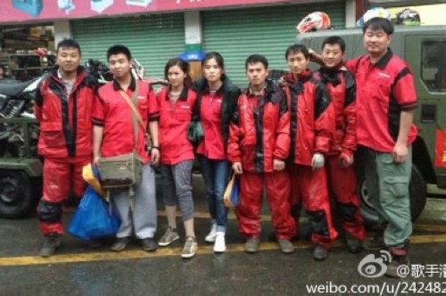 廖智(左数第三位)在汶川地震中失去双腿的廖智参与了雅安地震的志愿者工作,在四天的工作中,她靠着祷告得力,身边的人因着她充沛的精力而感谢主。
