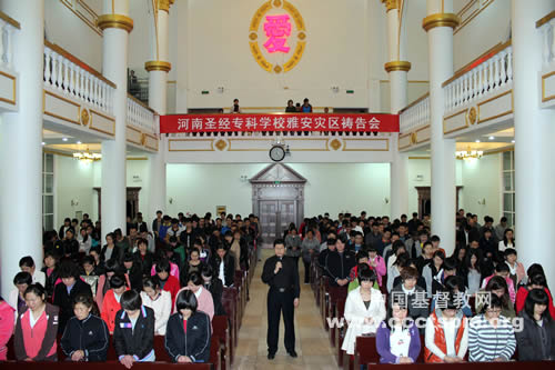 2013年4月24日19:30至21:00,在河南圣经专科学校二楼礼拜堂内,全体师生300多人为雅安地震灾区举办了专题祷告会。