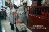 王文欢牧师、郝萍牧师和当天早上来证道的山东神学院王孟坤牧师带头为灾区同胞捐款奉献。