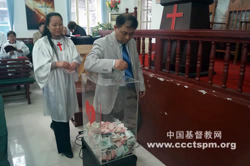 王文欢牧师首先领大家起立为地震中遇难的同胞、为救灾中牺牲的解放军和武警战士默哀,证道结束后举行了奉献捐款仪式。