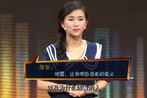 她说,汶川地震时,父亲的不离不弃让她活了下来。她说,地震前,不知道为什么而活,但是地震,让她震醒,让她明白活着的意义。她认为,灾难,给了她重生,灾难,是很好的老师。