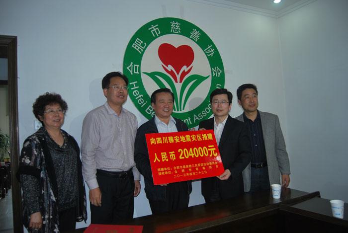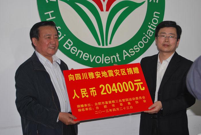 4月27日16:00,合肥市基督教堂主任牧师、合肥市基督教三自爱国运动委员会主席薛连喜牧师、合肥市基督教协会会长黄保俊牧师一起来到了合肥市慈善协会,参加为四川雅安地震灾区举行的救灾捐款仪式,为雅安灾区捐款人民币204000元。自雅安地震以来,弟兄姊妹们心系雅安,情系雅安,共同为雅安祈福祷告,愿上帝祝福,带领雅安同胞早日走出伤痛、刚强壮胆,重建家园……