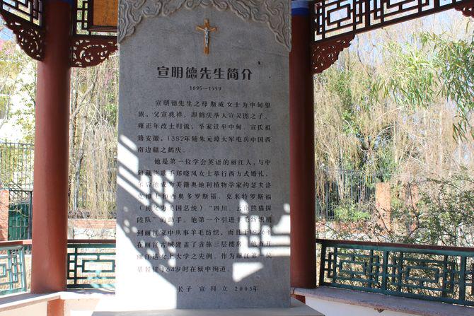 走进丽江的宣科庄园,进门后向右转再往前走一点,会看到一个古亭,亭子里有一个碑,上面的十字架吸引着记者的脚步,走近一看,那是宣科给他的父亲宣明德所立,这次采访便从其间的这行字开始:作为丽江的第一位基督徒于64岁时在狱中殉道。