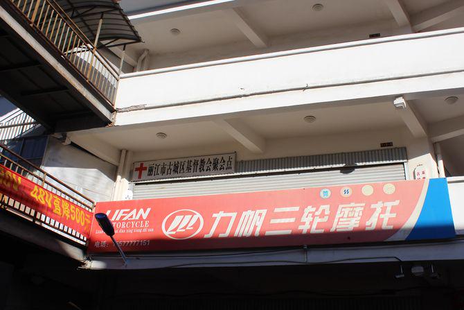 跟随着古城区教会的杨弟兄,进入一个小区,要直走一段路程,然后左拐再右拐,才能找到古城区教会的聚会点,在一座出租楼的二楼,一楼是“力帆三轮摩托”的店铺,而教会的另一侧对面则是饭店林立,由于二楼的圣殿门在做礼拜时是开着的,礼拜时对面还时不时地传来世俗流行音乐的声音,还好牧者的讲道声音足够洪亮、从麦克风里传出来的声音够大。
