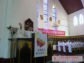 走进南京莫愁路堂,教堂圣台后墙上挂着的横幅分外明显——“莫愁路堂为尼泊尔和西藏灾区的救灾祈祷”。
