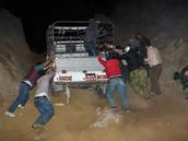 受地震影响,原本就崎岖不平的道路更加难以通行。在一处接近180度的转弯处,因塌方引起的山体剥落及连日来的车辆碾压,造成路面集尘厚达半米。货车冲坡近二十次,多次险些倾覆,最终在众人的合力推动下,耗时一个小时才艰难通过。