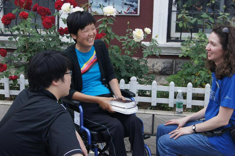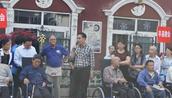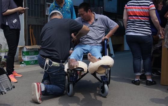 此次发放的轮椅全部由美国·琼妮之友爱心组织捐赠,根据每一个残疾人的情况亲自现场安装调试,并教会他们如何使用。在与残疾人的接触中,他们真正地把每一个残疾人当人看,就是那些脚已腐烂的人,他们也不怕脏、不嫌臭,主动与他们握手。为了调试好,有时他们还得跪在地上,特别是有的人都70多岁了。为了赶时间,他们从早到晚一直忙碌安装调试,有的连水都顾不得喝,且轮流着吃饭。他们周到、细微的爱心举动深深打动着在场之人的心。