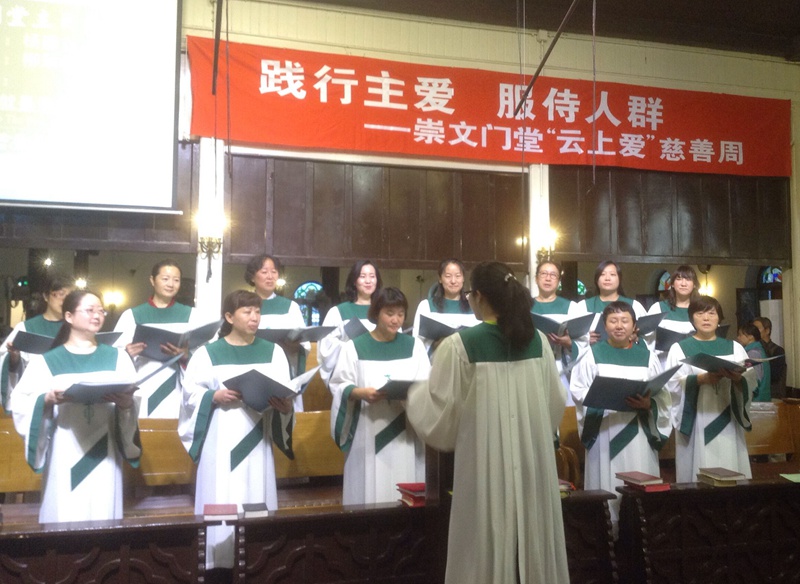 当天,走进崇文门教堂,一个写有“践行主爱 服侍人群——崇文门堂‘云上爱’慈善周”的红色条幅悬挂在内。为何将今年的慈善周活动命名为“云上爱”呢?该堂牧师杨建立解释,云是见证的象征(来12:1),“云上爱”就是天堂的爱,是从上帝而来的爱;崇文门堂希望弟兄姐妹们能够把这份“云上爱”带到这个世界每一个需要爱的角落。