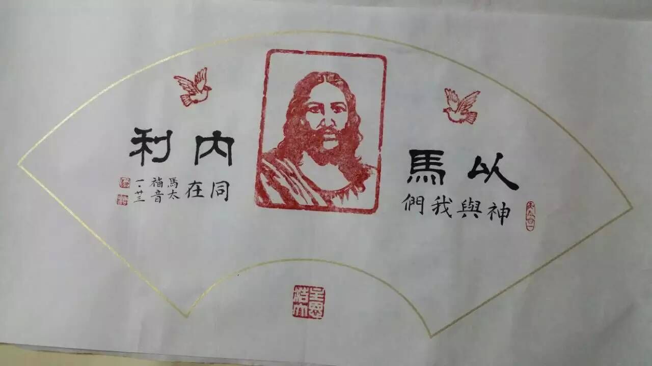两幅作品皆以救主耶稣的头像为中心,其中一幅外形似折扇,内写“以马内利”等字;另一幅作品外形为十字架,内写有约翰福音3章16节的经文:“神爱世人,甚至将他的独生子赐给他们,叫一切信他的,不至灭亡,反得永生。”
