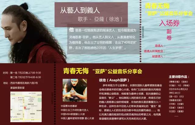 陕西省西安市基督教景新教堂将于本周末举办两场以“青春无悔”为主题的亚萨公益音乐分享会。