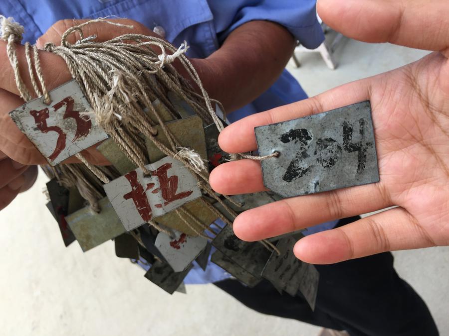 说起这串车牌卡片,雷大爷颇感自豪。“这是铁皮,先用剪子一点点剪下来,然后再用钉子钉出孔,再拴上绳子,最后用油漆写上字。你看,这两个牌子的号码都是一样的,不一样的绝对不能从这个门出去。”雷大爷说。