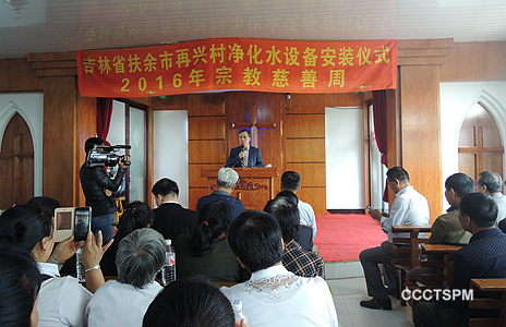 2016年9月19日下午,基督教全国两会和吉林省基督教两会在吉林省扶余市再兴村举行净化水设备捐赠及安装仪式。中国基督教三自爱国运动委员会副主席徐晓鸿牧师、吉林省基督教两会主席孟繁智牧师、秘书长办公室主任陈喜河牧师及副主席、副会长、社会服务部主任肖亦星牧师、吉林省扶余市基督教宗教局修局长及扶余市两会孙长老、孙牧师等一行9人走访扶余市再兴村教会,参加了此次2016宗教慈善周活动。