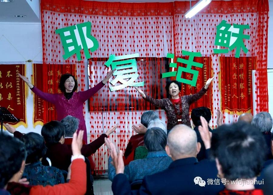 4月18日下午2:30,大连瓦房店迦南美地养老院细胞小组的老人在三楼活动室举行了复活节赞美会。郑副院长带领员工精心布置了会场。鲜红的幕布上“耶稣复活”四个绿色充满生命力的大字,为赞美会烘托了热烈的气氛。
