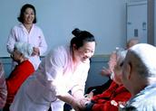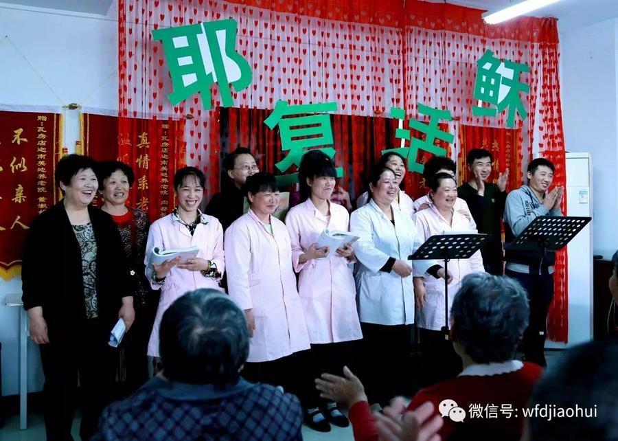 细胞小组的同工们早早就预备好了接待工作,把老人手把手送到座位。五楼特护护工为老人梳洗穿衣,用轮椅把他们推到赞美会会场。老人欢聚一堂,口唱心和赞美主。细胞小组组长顾秀梅和刘双桂带领老人献唱手语舞《复活在我》,郑副院长为老人献唱《我告诉你》,特护护工栾雪萍、吴美红、丁冬梅为老人献唱《我要向主唱赞歌》,全体员工献唱《现在的生命不属我》。郑副院长、小组同工们、护工们一一走到老人们中间,和老人们拥抱握手,很多老人感动得热泪盈眶。