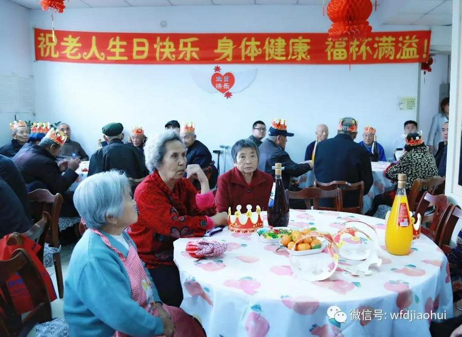 养老院一楼的餐厅被员工们装饰一新,棚顶悬挂的红灯笼,墙上挂着鲜红的条幅,喜庆极了。老人们则是围着圆桌,边享用桌子上的橘子糖果,边欣赏用以往养老院老人们活动照片做成的幻灯片,背景音乐是温馨的生日歌。员工们忙着给过生日的老人戴上生日帽,在这幸福的时刻,老人们脸上露出了灿烂的笑容。