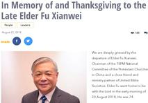 8月20日,中国基督教官网发布消息:中国基督教三自爱国运动委员会主席傅先伟长老,于2018年8月20日凌晨4时30分在上海华山医院安息主怀,享年74岁。截止到目前,基督教两会共收到97封来自海内外的唁电唁函。