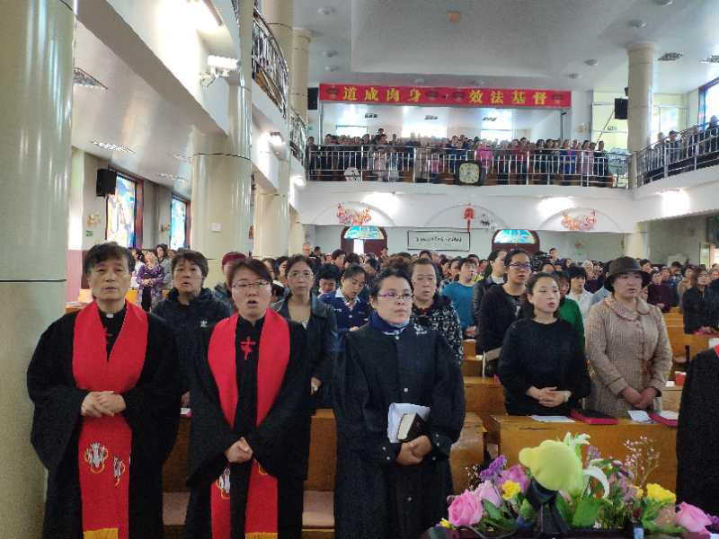 接下来,进行了复活主日的施洗圣礼,由杨森林牧师主持,并为弟兄施洗,邰金宝长老襄理;谢春兰长老主持为姊妹施洗,陈丽长老襄理,先后为十多位弟兄和近五十位姊妹实行了点水洗礼,耿福琴牧师为领受洗礼的弟兄姊妹献上代祷,大家以热烈掌声欢迎新加入教会的弟兄姊妹。此后由陈丽长老主持了圣餐礼,带领作认罪祷告,祝福圣饼圣杯,然后由执事进行分赐,宣读了相关经文,最后陈长老做祝福祷告。在牧师祝福声中,圣餐礼圆满结束,大家相互致平安。
