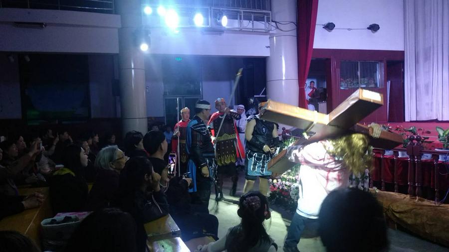 当天晚上,大家又兴致勃勃地欢聚一堂一起观赏了“愿你们平安!”2019年“复活之夜”赞美感恩晚会。主领人为王帅传道,首先以诗篇118:16宣召,会众歌诗《永活全能的神》,谢春兰长老献上代祷,段燕青传道宣读了约20:19----29的经文,之后刘亚晶姊妹献唱了《我的救赎主活着》,舞蹈组表演了精心排练的舞蹈《十字架的花朵》、《与神和好》,不时赢得阵阵热烈掌声;圣剧组同工表演了《耶稣的一生》圣剧,从耶稣受洗、教训门徒、传道、医病、拉撒路复活、预备晚餐、客西马尼园祷告、被捕、钉十字架、埋葬、复活显现等情节,通过演员投入真情的表演,真实再现了耶稣一生的脚踪,通过精心设计的服装、对白、舞台音效包装,具有深深的感染力。特别是耶稣上十字架的情景,震撼心灵,使人无不流下热泪。当晚还是主日晚祷会活动时间,朱红丽传道和李秀萍传道分别为世界、国家教会以及众弟兄姊妹的婚姻家庭、疾病、面临的各样难处一一献上代祷,邰金宝长老最后做祝福祷告。