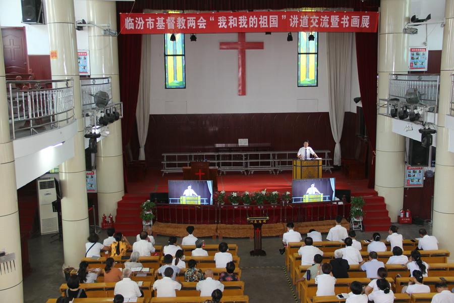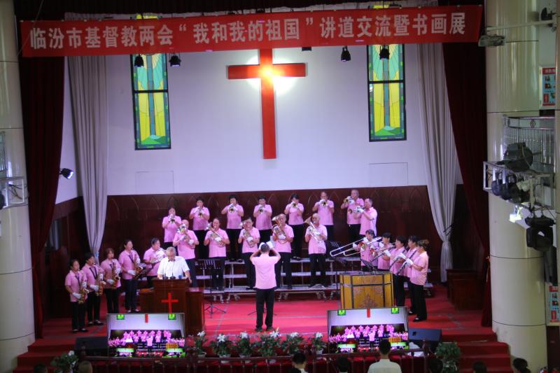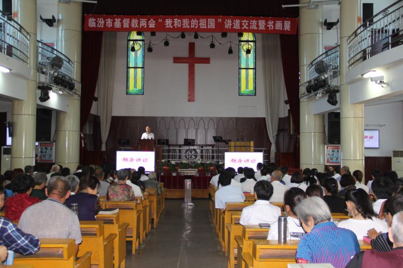 8月29日上午,山西临汾市基督教两会在尧都区城区堂隆重举行“我和我的祖国”讲道交流暨书画展。来自各县市区的两会常委、牧长同工一百余人前来参加这一盛会。