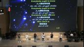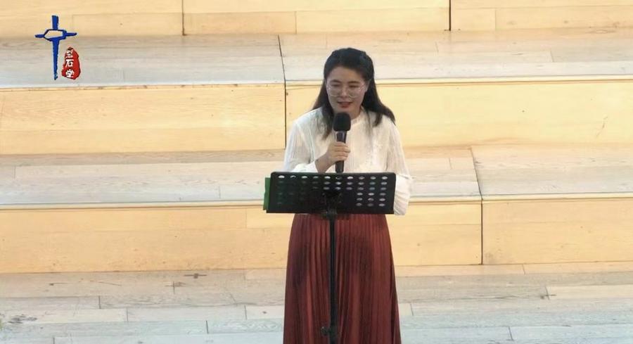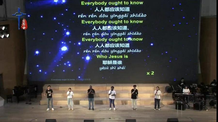 赞美会开始,屏幕上,醒目的十字架闪烁着蓝色的星光,双语团契献唱《人人都应该知道》和《你是我的一切》,向弟兄姐妹和慕道友朋友传讲耶稣是宇宙万物的创造者,是我们每个人的一切。
