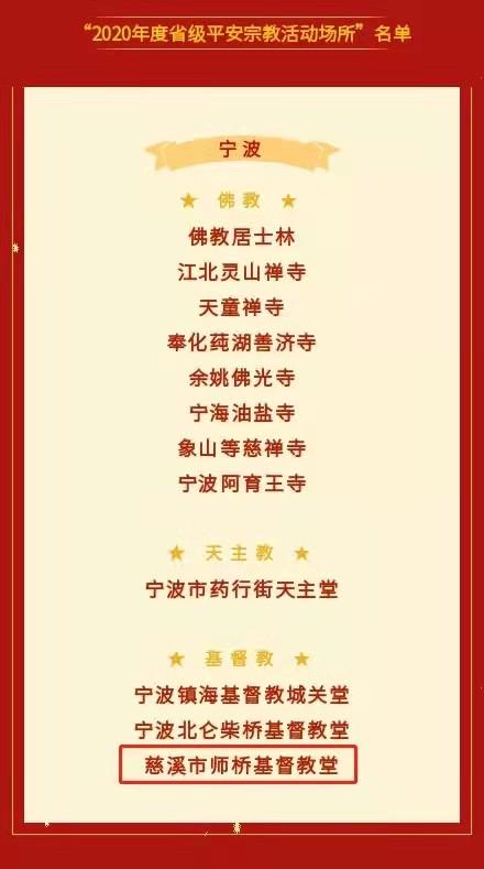2021年10月25日,浙江省民宗委对“2020年度省级平安宗教活动场所”进行了通报,全省表彰的111所宗教活动场所有基督教(包括天主教堂)有38所榜上有名。宁波市有四所基督教(含天主教)教堂光荣登榜。
