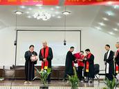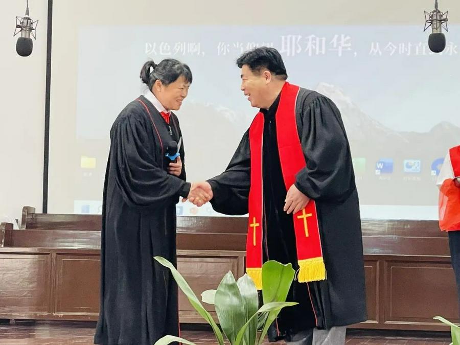 张志祥牧师,陆玉和牧师对新派立的长老赠书,期待陆艳长老更好的在神的话语上装备自己,丰富属灵生命。