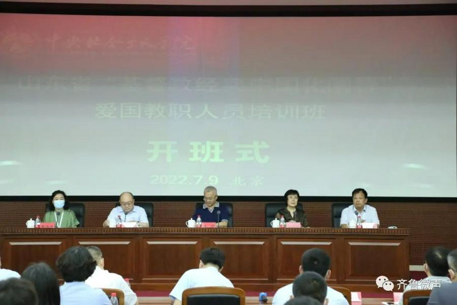 7月9日,山东省“基督教经典中国化阐释”培训班在中央社会主义学院开班,中央社会主义学院党组成员、副院长袁莎出席开班式并讲话,中央社会主义学院教培工作指导小组副组长、民族宗教组组长张勤民主持开班式,山东省民族宗教委党组成员、副主任明子春出席开班式并致辞,山东省基督教三自爱国运动委员会主任高明、省基督教协会会长董美琴,以及来自山东基督教界的78位学员参加开班式。