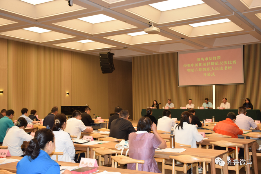 8月29日至31日,山东省潍坊市基督教两会举办基督教经典中国化阐释讲道交流比赛暨第六期教职人员读书班。省民族宗教委有关处室同志,潍坊市委统战部副部长、市民族宗教局局长刘世海,省基督教三自爱国运动委员会主任董美琴牧师,省基督教三自爱国运动委员会副主任、潍坊市基督教三自爱国运动委员会主任陈光旭牧师,省基督教三自爱国运动委员会副主任、临沂市基督教三自爱国运动委员会主任张建顺牧师,省基督教三自爱国运动委员会秘书长王伟牧师出席活动,12个县(市、区)基督教三自爱国运动委员会主任、讲章撰写者及55周岁以下的神学毕业教职人员共41人参加活动。