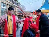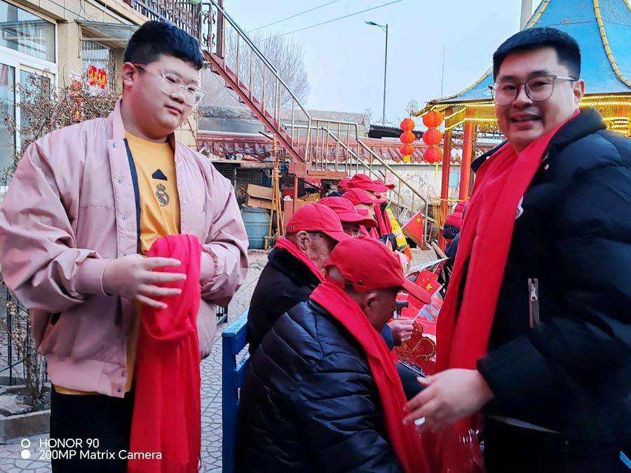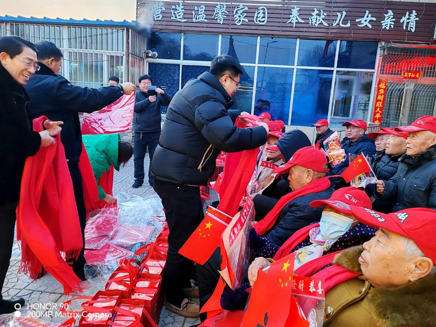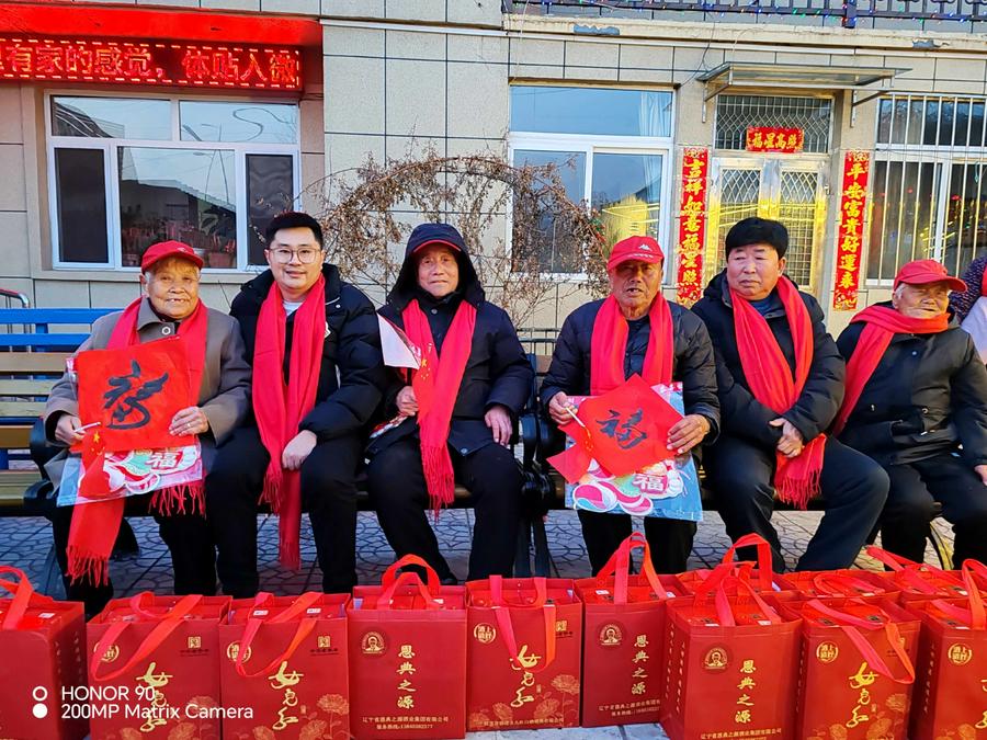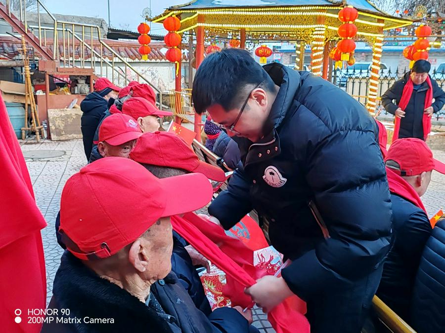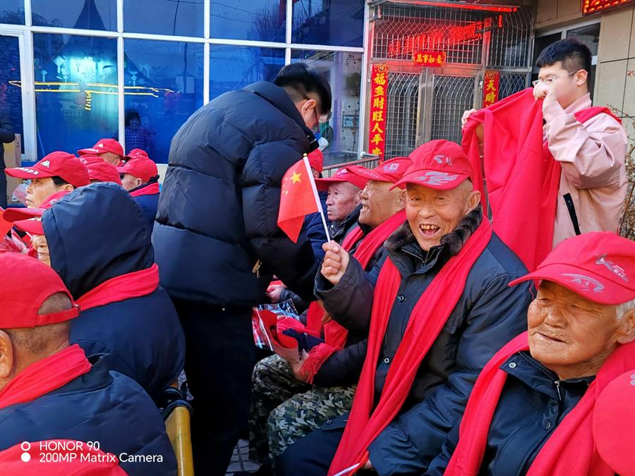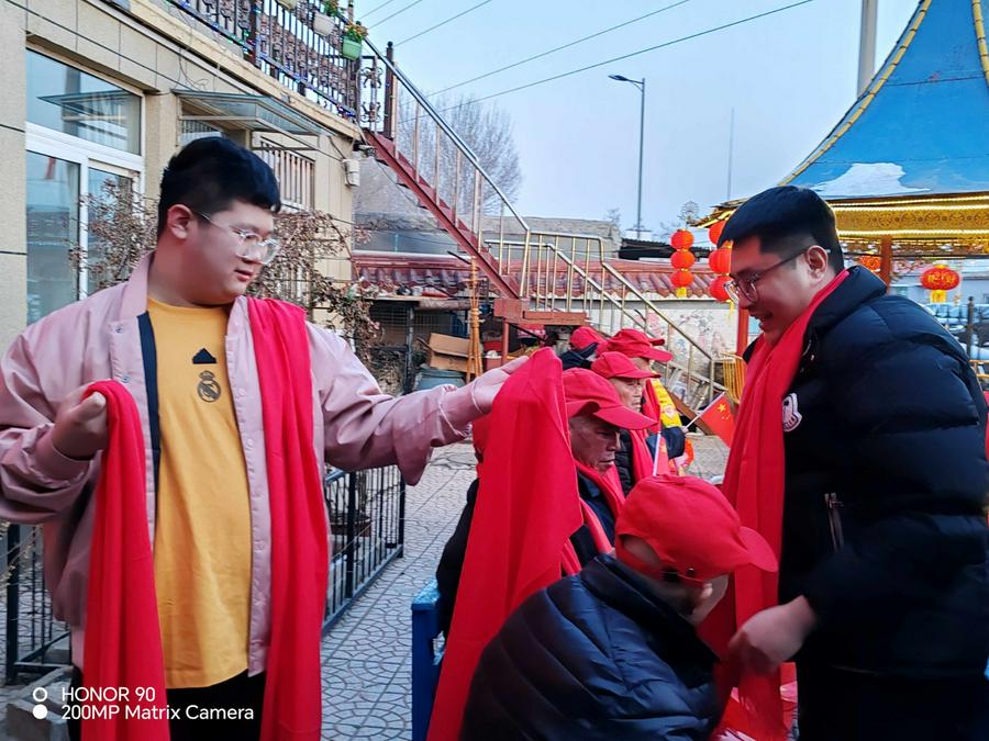今天是除夕,马上进入中国农历的甲辰新年,任牧师他们为每位老人佩戴上红红的围巾和一面手持的国旗,一幅有书法家书写的大红“福”字,又为各位老人献上年夜饭所用的“女儿红·恩典之源”的红瓶美酒和洗涤用品,价值共有3000多元人民币。在此时,红红的国旗、红红的围巾、红红的“福”字、红红的美酒加上每位老人佩戴的红色帽子,他们的脸上露出开心的笑容,呈现出一派喜庆的节日、欢欢喜喜过大年的气氛。