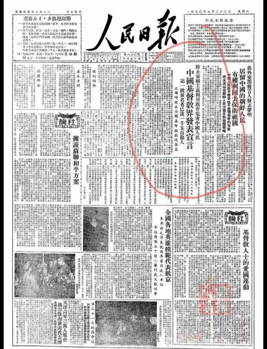 1950年7月19日,毛泽东在审阅吴耀宗等人起草的《中国基督教在新中国建设中努力的途径》(即“三自革新宣言”)后,批示周恩来:“吴耀宗文件是很有用的,请考虑用内部文件方式电告各中央局及各省市委,并要他们注意赞助”。