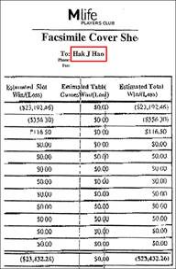 ▲在赌场的韩鹤子(左)及相关的米高梅(MGM)集团赌场收支报告(右)